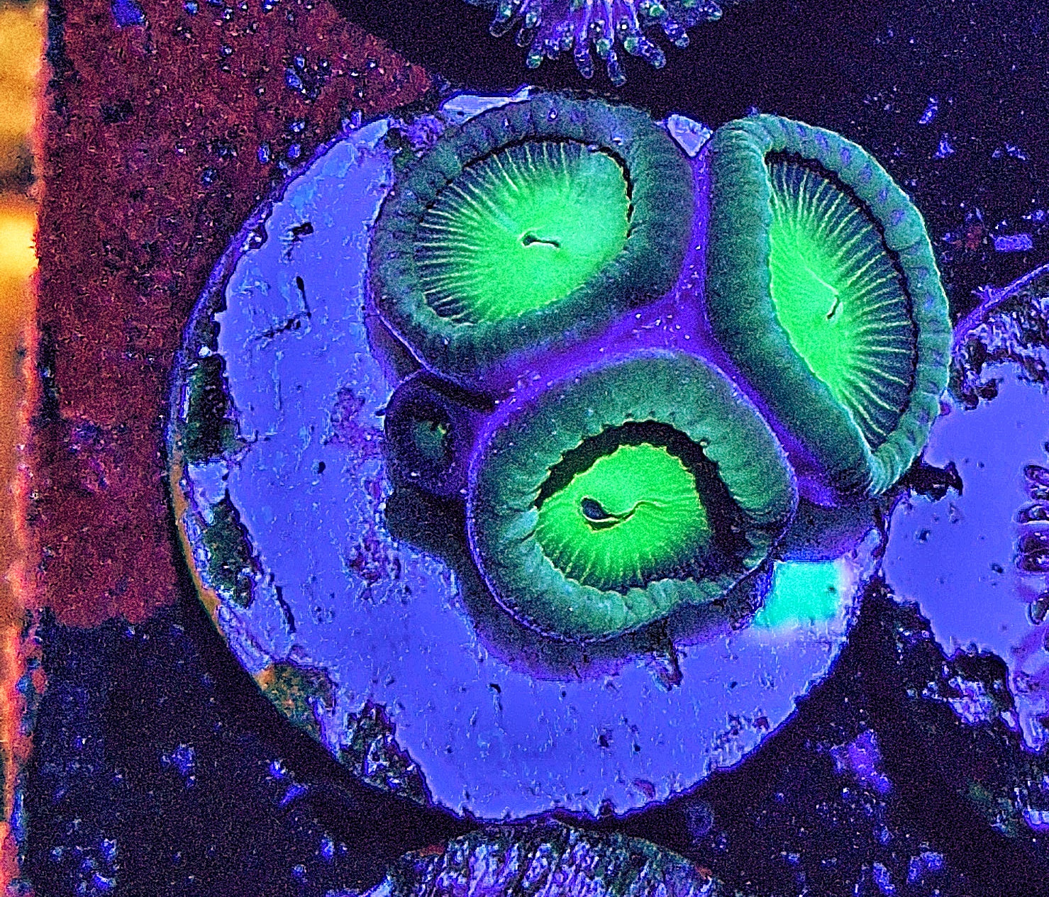 Easy under normal reef parameters, thrives under most lighting and flow variations. Great as a gap filler in areas other corals refuse to thrive in. Blue lighting highlights their vivid green interior.